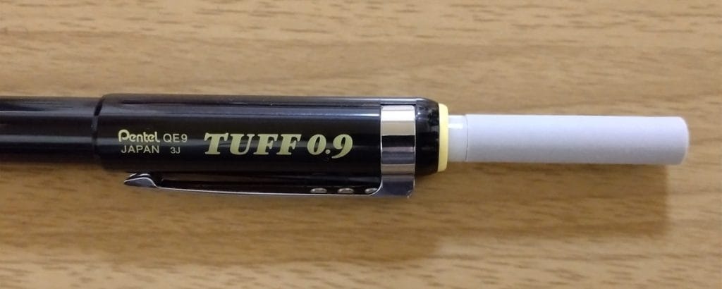 ペンテルの「タフ」は、その名のとおりガンガン書けるタフなシャープペンシルで、大型の消しゴムが搭載されていることも特徴です。