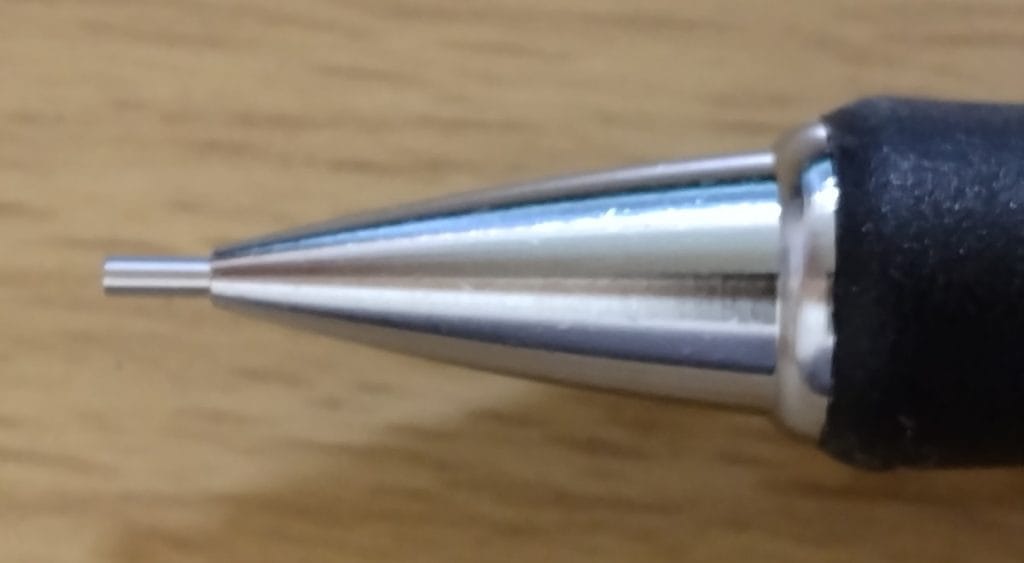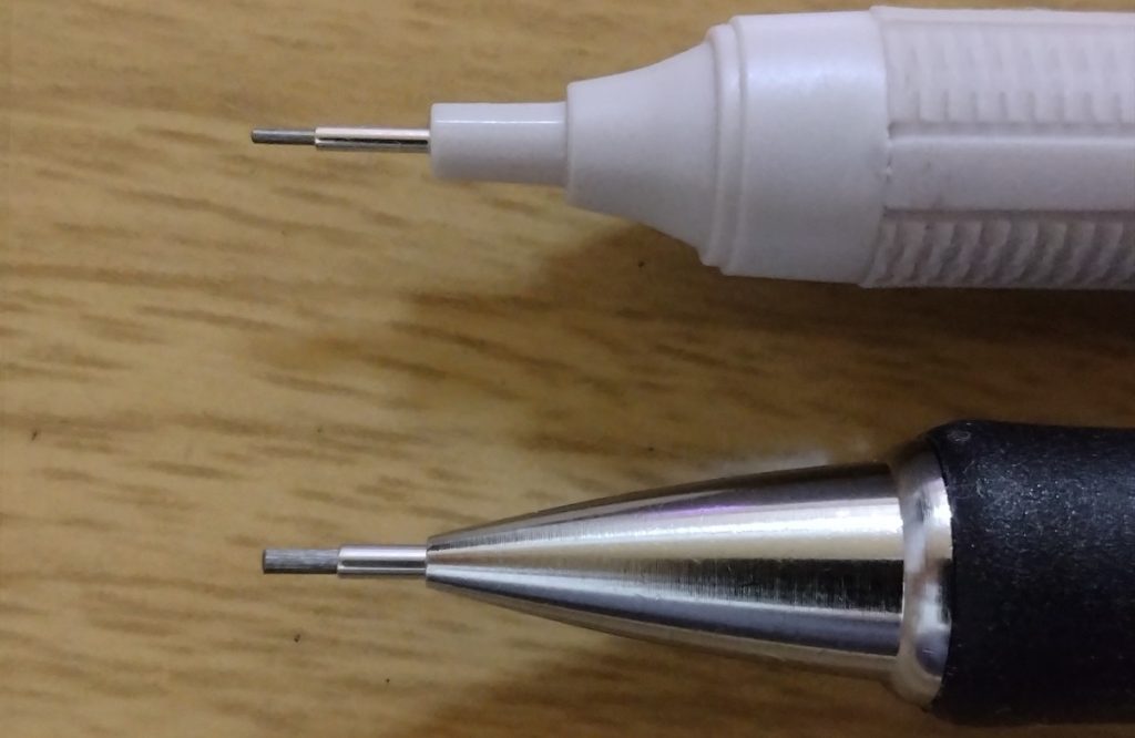 他のペンと比べるとよく分かりますが、太めの先金から同じぐらいの太さの芯が出ています。